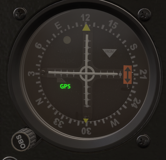 Когда вы переключитесь в режим NAV и OBS, ваш радиал синхронизируется с прибором OBS и если там у вас будет выставлено 200 градусов, как мы делали выше, то через точку U, проведется линия с радиалом 200 градусов. А планка будет показывать что мы сейчас смещены относительно данной линии. Вращая ручку OBS мы можем задавать тот курс, который нам нужен.