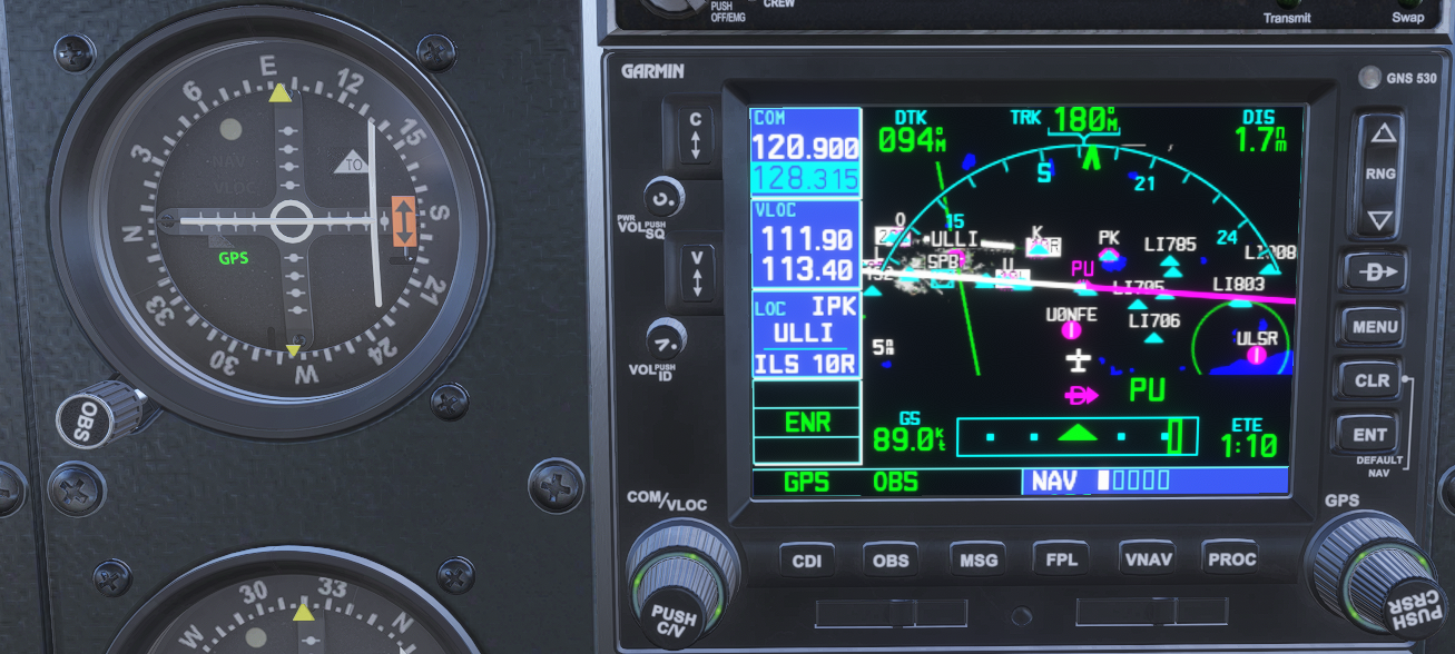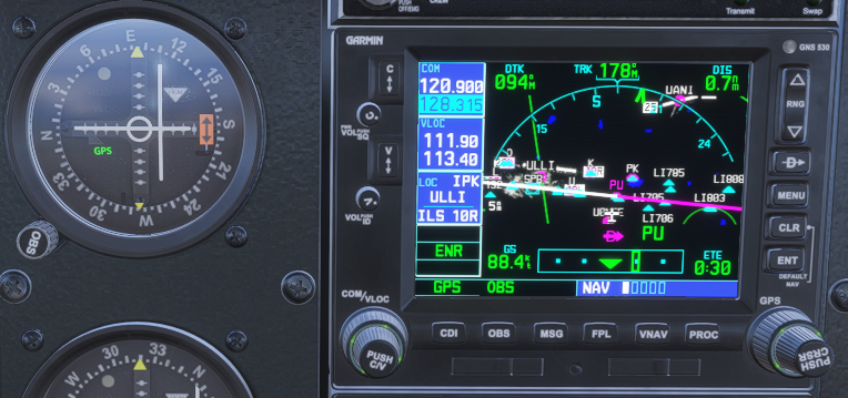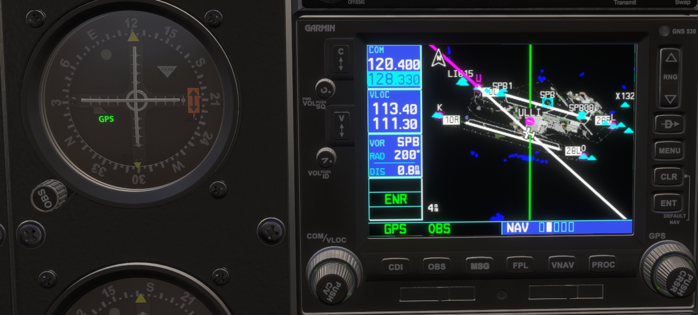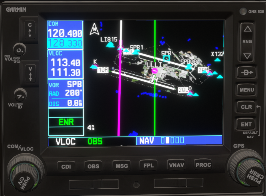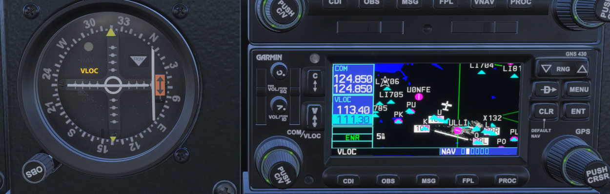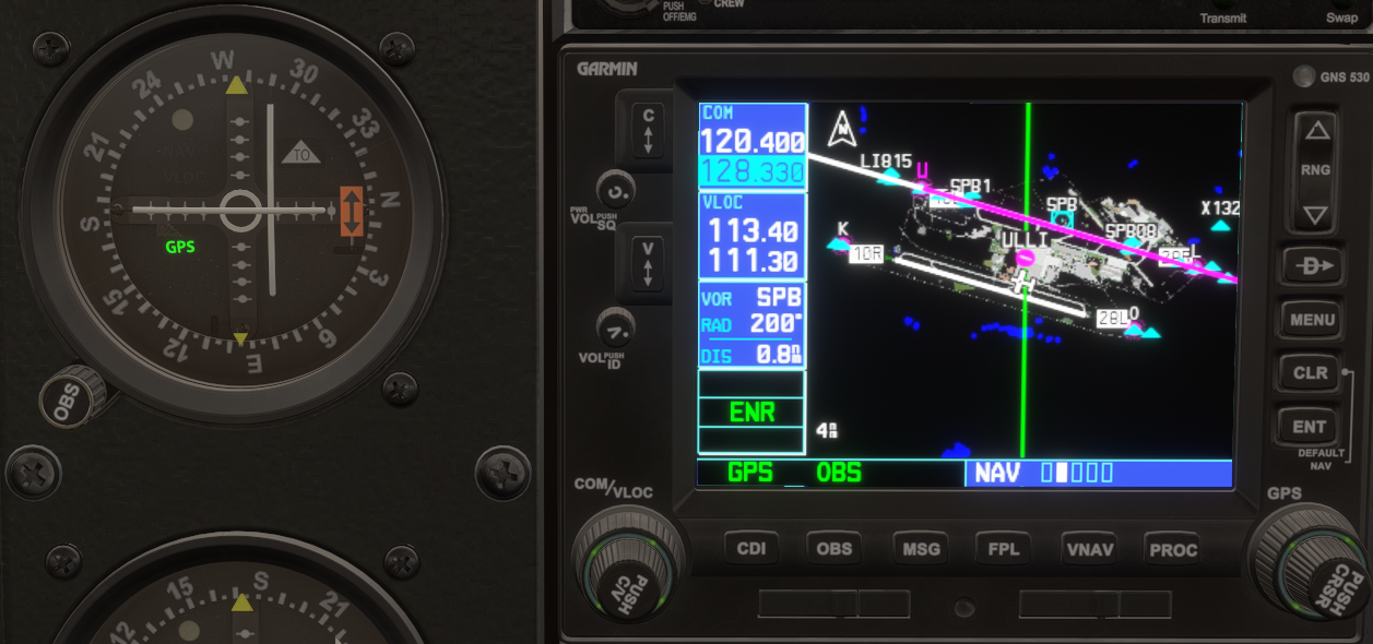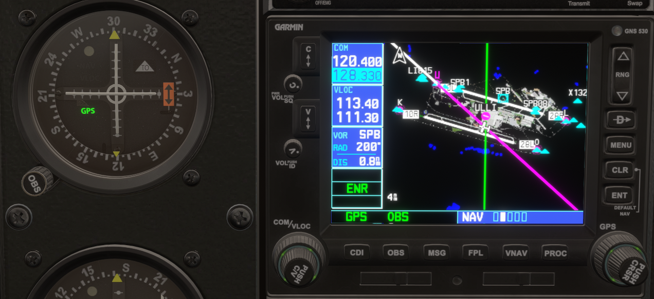 Вертикальная планка встала по центру, это означает что мы находимся на нужном радиале, если вы поставите 199 или 201 то увидите, что планка перемещается влево-вправо, показывая что мы уходим с маршрута. Как итог, мы можем лететь удерживая эту планку по центру, мы всегда уверены что находимся на нужном радиале. Настроив GNS430 на другой VOR маяк со своим радиалом, мы можем лететь до их пересечения а затем, например, совершить поворот.