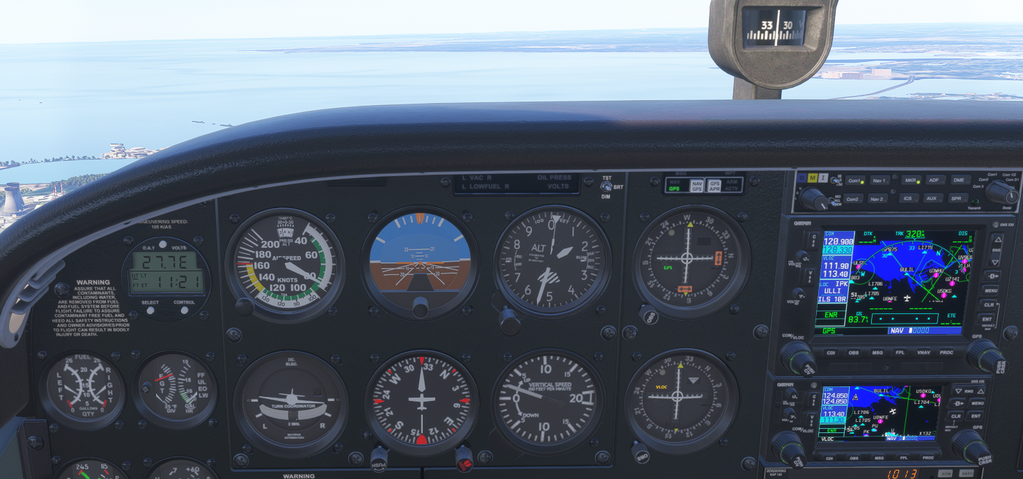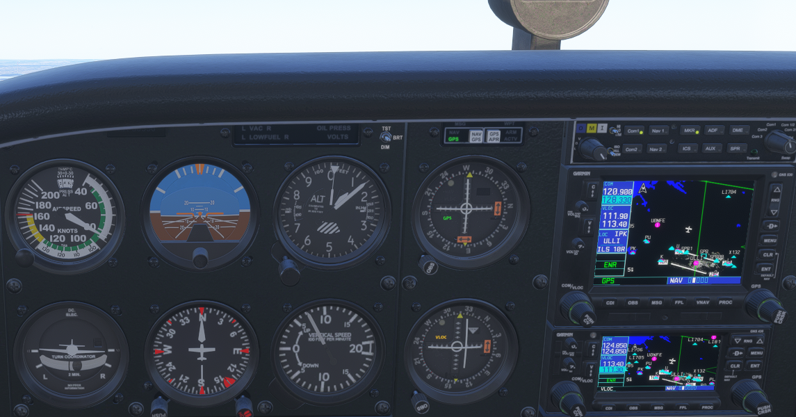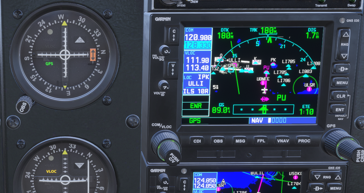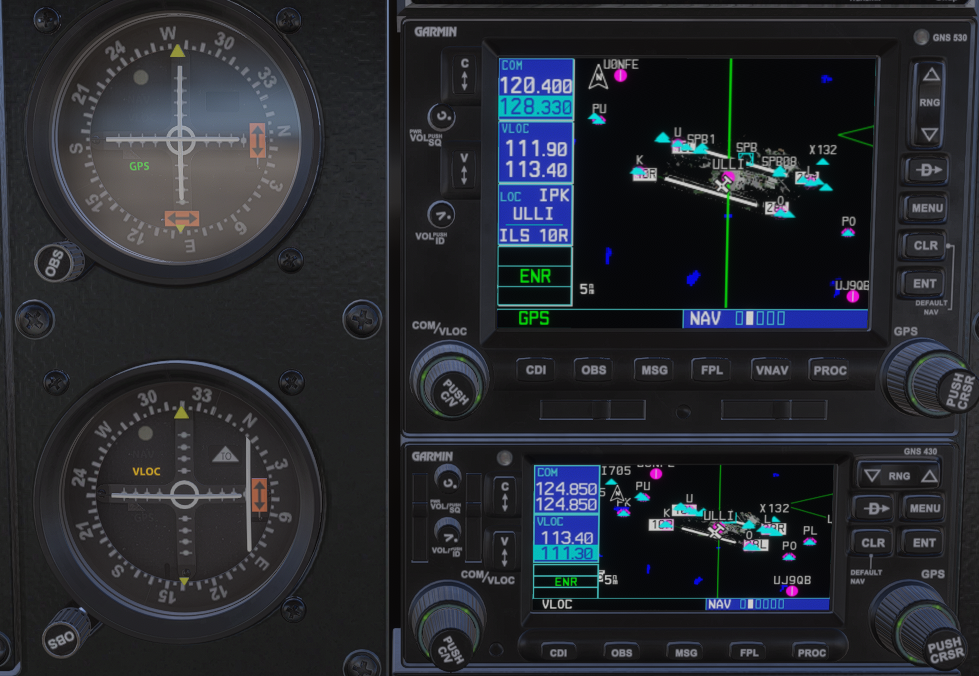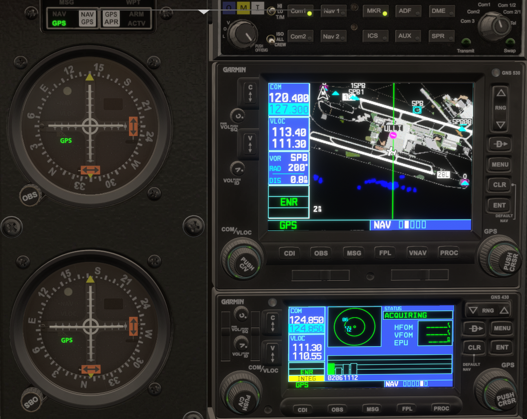 Итак, по кругу мы с вами полетали. Пришло время разобраться с навигацией в Cessna 172. Для этого на борту у нас есть 2 навигационной системы Garmin GNS530 и Garmin GNS430. В нашем случае 530 сверху а 430 снизу. Они идентичны, только у 430 меньше экран. Ну и соответственно на 530 мы используем COM1, на 430 – COM2.