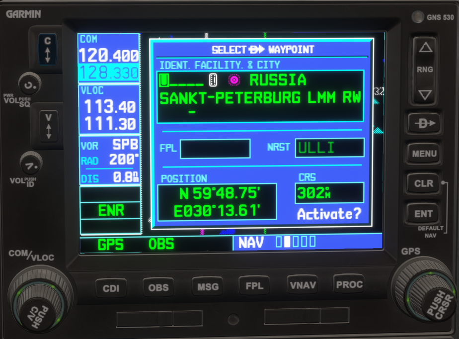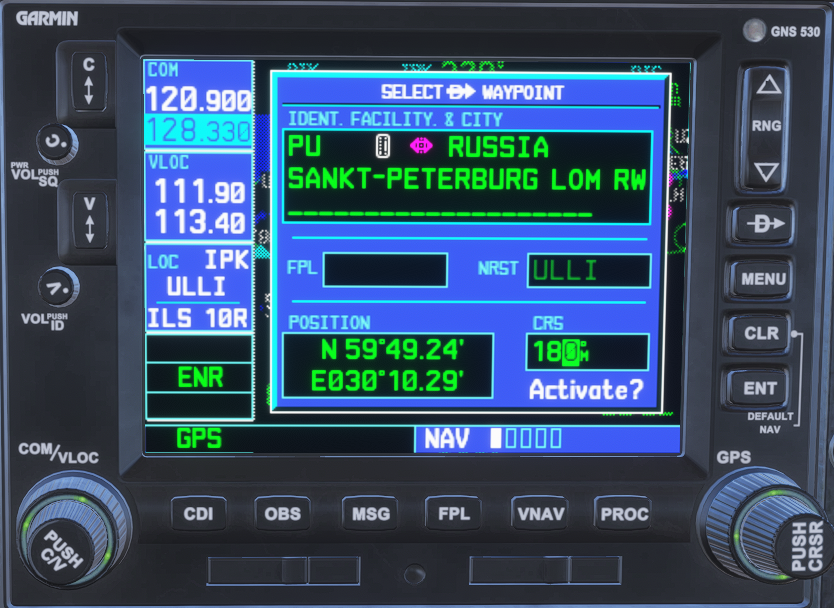 После установки, нажимаем кнопку ENT, справа и с помощью большой крутилки переходим на строку Activate, затем нажимаем ENT. Затем нажимаем кнопку CDI и OBS внизу нашего прибора.