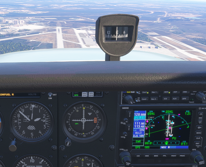 Теперь наша планка показывает что мы еще не долетели до курса полосы, и если мы продолжим лететь прямо, до долетим до оси полосы. Обратите внимание, внизу на зелены треугольник и справа прямоугольник, по мере приближения к оси полосы прямоугольник тоже будет двигаться. Когда прямоугольник будет точно посередине треугольника, значит мы сейчас на нужном курсе. Учтите. чтобы точно выйти на курс, нужно поворачивать чуть заранее, так как самолету нужно какое то время для разворота. Я обычно начинаю поворот, когда прямоугольник находится на одну точку в стороне.
